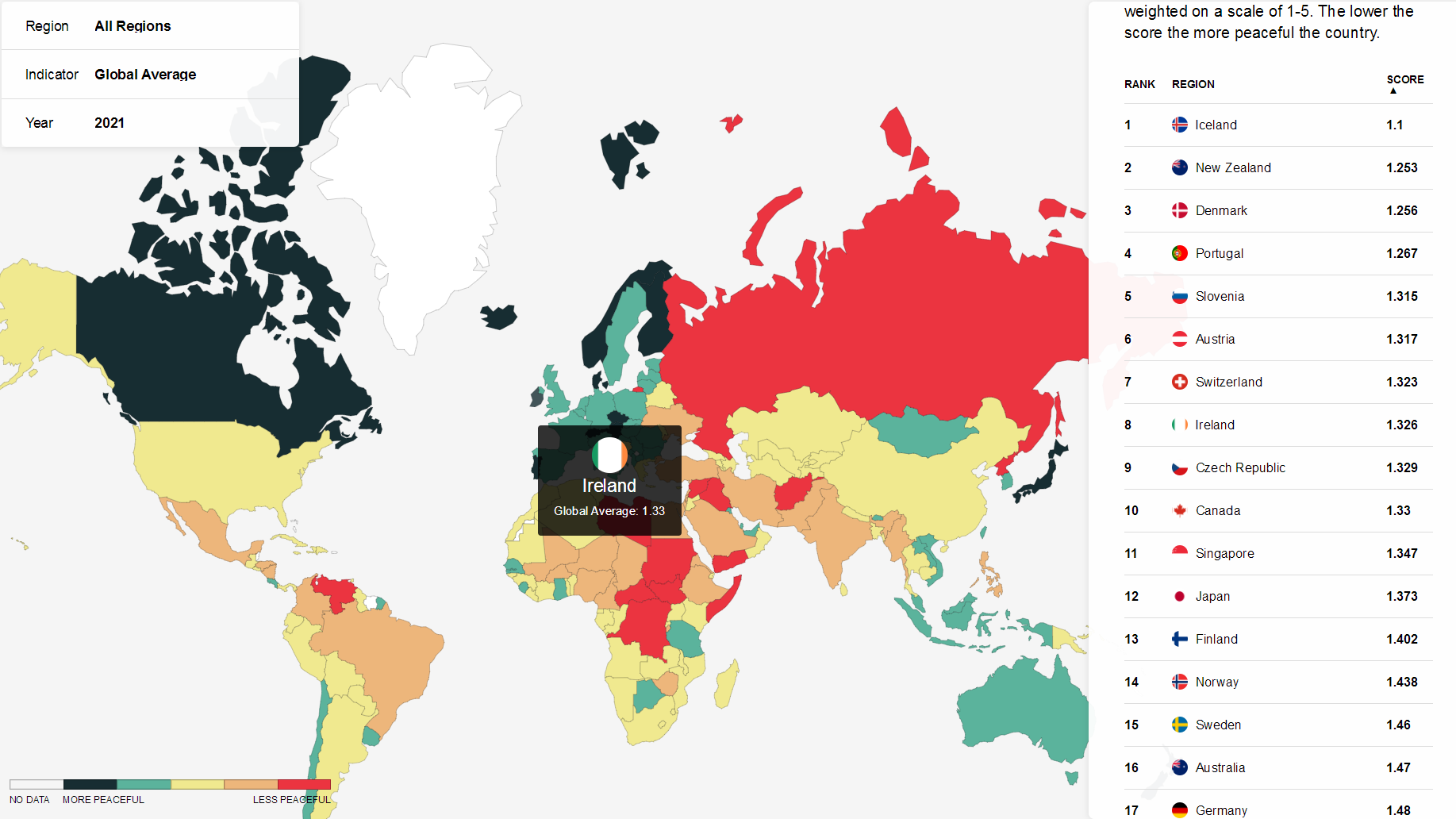 2021年,冰島再次蟬聯全球最和平國家,新西蘭、丹麥緊隨其后,分獲第2、第3名。對比2020年排名,新加坡跌出前十,愛爾蘭前進3位取而代之。此外,日本排名第12,澳大利亞排名16,英國排名33,而美國排在第122名。